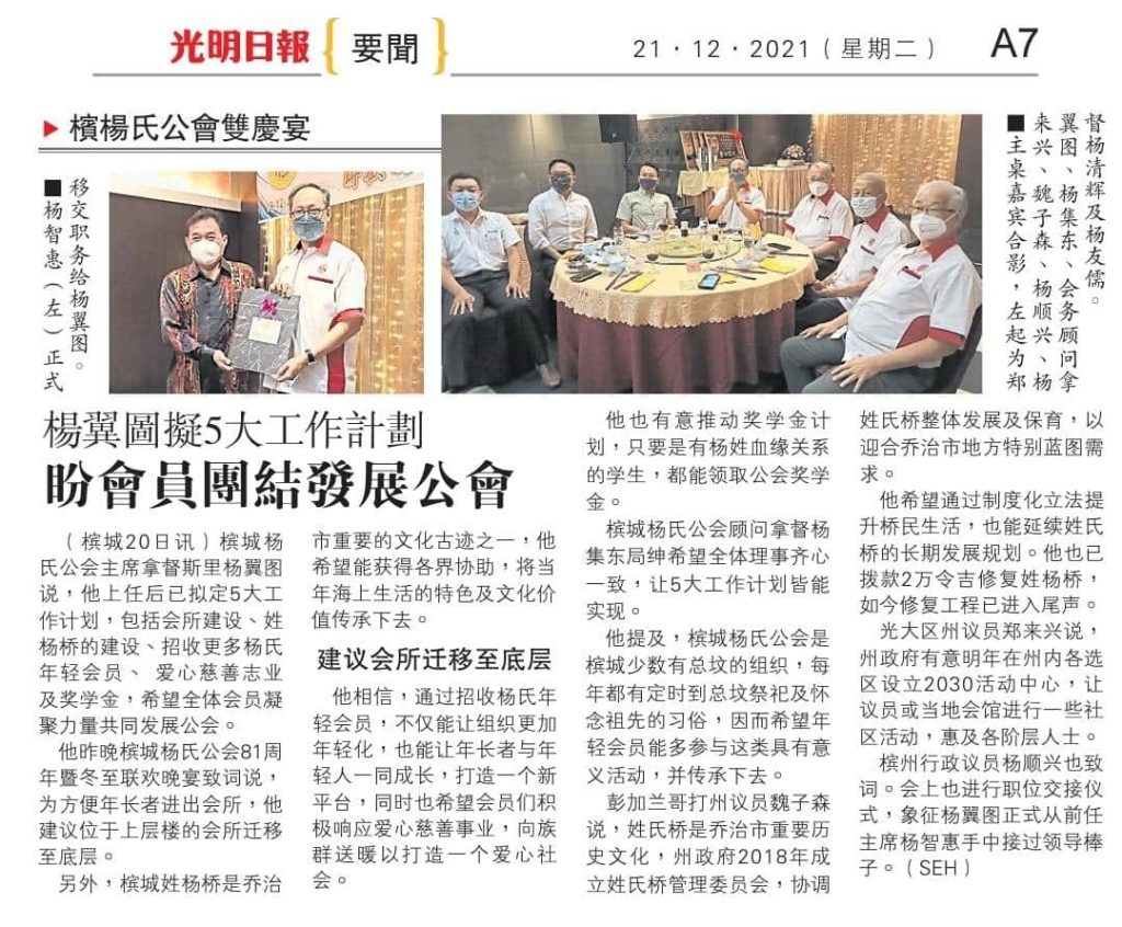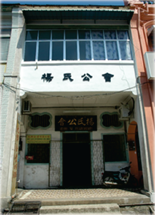华人移居槟榔屿是继马六甲后,为马来半岛各州华人最早落户的地方。杨氏族人早期登陆槟榔屿(槟城),具体日期已难考证。大英帝国是于 1786 年开辟槟城为殖民地的。根据英殖民政府史料记载,开埠以前,岛屿上只有 58 名华人和马来人,但是在一年之后,华人已大量的涌入。1789 及 1808 年槟城乔治市曾发生两次大火灾,华人都出钱出力重建市集。根据峇都兰樟福建义山 1805 年的碑中记载,重建市镇的捐款人中,杨性捐款人共有 8 人。因此,杨牲族人在 1800 年就已聚居槟城。